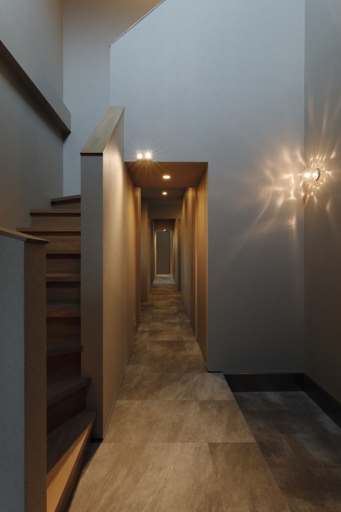 玄関正面の壁にはミラーを設置し、姿見としても使えるようにしたほか、玄関からの通路が延々と続くように見える点もポイントです。