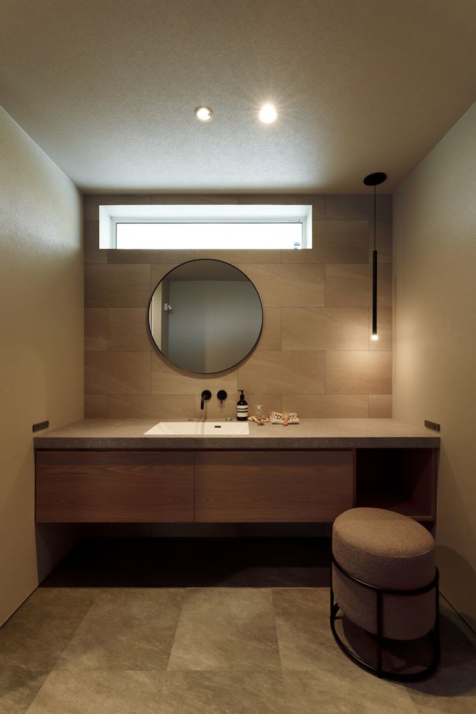 洗面所のミラーや照明はネットで見つけて、ひかり工務店さんのコーディネーターさんに相談しながら、妻自身がイメージする空間に合うものを選んでいました。